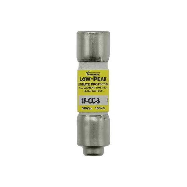 Fuse, 3 A, 600 V AC, 150 V DC, Class CC, LP-CC Series, Non-Indicating, Time-Delay, Body Style Cylindrical, Fits Fuse Block Style Rejection, Interrupt Rating 200kA at 600V AC, 20kA at 150V DC, Fuse Size 1-1/2 in L x 13/32 in dia, Length 1 1/2 in, Diameter 13/32 in, Equivalent Brand and Series Bussmann LP-CC, Littelfuse CCMR, Mersen ATDR, Equivalent Series ATDR, CCMR, LP-CC, Compatible Fuse Block Series BCM, BMM, CCP2-X-X-CC, CCP2-X-X-M, CHCC, CHM, HEB, HEX, HEY, HEZ, Body Material Melamine