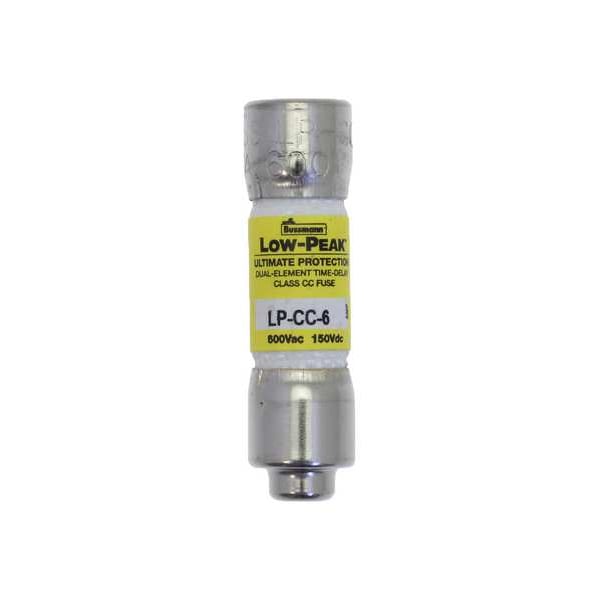 Fuse, 6 A, 600 V AC, 150 V DC, Class CC, LP-CC Series, Non-Indicating, Time-Delay, Body Style Cylindrical, Fits Fuse Block Style Rejection, Interrupt Rating 200kA at 600V AC, 20kA at 150V DC, Fuse Size 1-1/2 in L x 13/32 in dia, Length 1 1/2 in, Diameter 13/32 in, Equivalent Brand and Series Bussmann LP-CC, Littelfuse CCMR, Mersen ATDR, Equivalent Series ATDR, CCMR, LP-CC, Compatible Fuse Block Series BCM, BMM, CCP2-X-X-CC, CCP2-X-X-M, CHCC, CHM, HEB, HEX, HEY, HEZ, Body Material Melamine