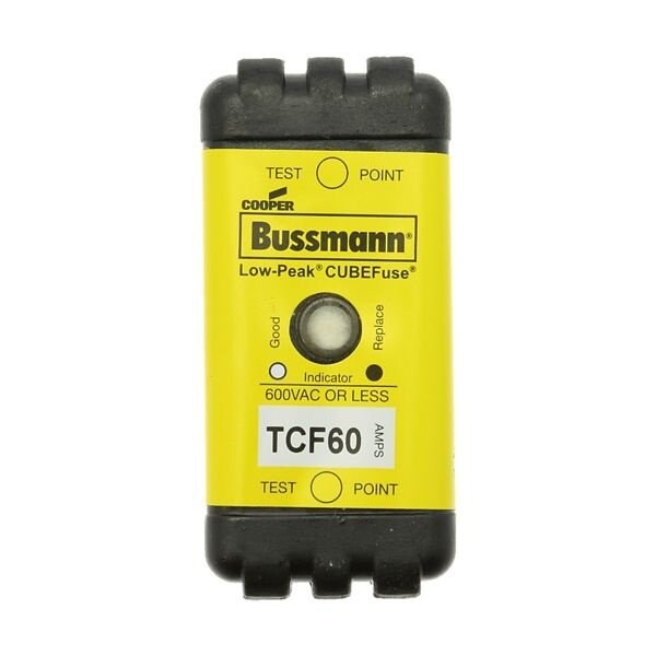 Eaton Bussmann Series Class CF fuse, TCF, time-delay, dual-element current limiting cube fuse, 90 A, indicating fuse, interrupting rating of 100 kA at 300 Vdc and 300 kA at 600 Vac. The revolutionary BussmannTM series Low-PeakTM CUBEFuseTM delivers the smallest footprint compared to any Class CC, J or RK fuse solution - requiring up to 70 less space when combined with its unique fuse holder or UL 98 Listed Compact Circuit Protector switch. Freeing up space is powerful. And the CUBEFuse does just that, while packing up to a 300 kA interrupting rating and enabling higher equipment short-circuit current rating (SCCR). Available from 1 to 400 amps.