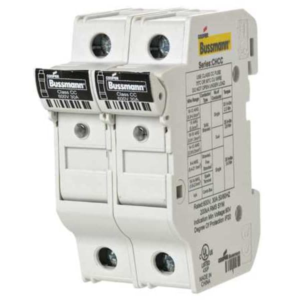 Fuse Block, Fits Fuse Type Class CC, Fuse UL Class CC, 0 to 30 A, Number of Poles 2, 600V AC/300V DC, For Fuse Size 1-1/2 in L x 13/32 in dia, Compatible Fuse Series ATDR, ATMR, ATQR, CCMR, FNQ-R, KLDR, KLKR, KTK-R, LP-CC, Series CHCC, Indicating, Rejection, Fuse Block Design Finger-Safe, Wire Range 18 to 4 AWG, Mounting Style DIN Rail, Body Material Thermoplastic, Connector Type Box Lug, Height 2.91 in, Width 1.38 in, Length 2.44 in, Standards CCC, cULus, RoHS