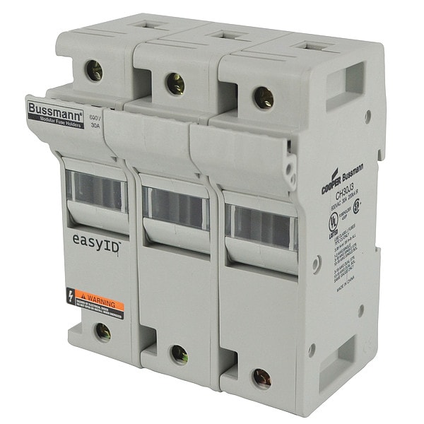 Fuse Block, Fits Fuse Type Class J, Fuse UL Class J, 0 to 30 A, Number of Poles 3, 600V AC/DC, For Fuse Size 2-1/4 in L x 13/16 in dia, Compatible Fuse Series A4J, AJT, DFJ, HSJ, JKS, JLS, JTD, JTD-ID, LDFJ, LPJ, LPJ-I, Series CH, Non-Indicating, Non-Rejection, Fuse Block Design Finger-Safe, Wire Range 18 to 3 AWG, Mounting Style DIN Rail, Body Material Thermoplastic, Connector Type Box Lug, Height 2.83 in, Width 3.84 in, Length 4.59 in, Standards CE, CSA Certified, UL Listed