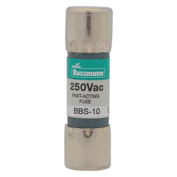 Fuse, 10A, 250 V AC, Not Applicable, Class Midget, BBS Series, Non-Indicating, Fast-Acting, Body Style Cylindrical, Non-Rejection, Interrupt Rating 10kA at 250V AC, Fuse Size 1-3/8 in L x 13/32 in dia, Length 1 3/8 in, Diameter 13/32 in, Equivalent Brand and Series Bussmann BBS, Littelfuse BLS, Mersen SBS, Equivalent Series BBS, BLS, SBS, Compatible Fuse Block Series BMM, CHM, Body Material Fiberglass, Single Element, Standards CE, CSA, UL Listed