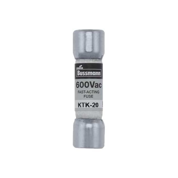 Fuse, 20 A, 600 V AC, Not Applicable, Class Midget, KTK Series, Non-Indicating, Fast-Acting, Body Style Cylindrical, Non-Rejection, Interrupt Rating 100kA at 600V AC, Fuse Size 1-1/2 in L x 13/32 in dia, Length 1 1/2 in, Diameter 13/32 in, Equivalent Brand and Series Bussmann KTK, Littelfuse KLK, Mersen ATM, Equivalent Series ATM, KLK, KTK, Compatible Fuse Block Series BM, BMM, C2617, C5268, CHM, HEB, HET, HEX, HPG, HPS, OPM-1038, OPM-NG, Body Material Melamine, Single Element