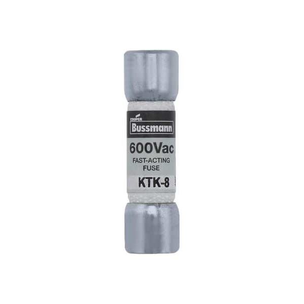 Fuse, 8 A, 600 V AC, Not Applicable, Class Midget, KTK Series, Non-Indicating, Fast-Acting, Body Style Cylindrical, Non-Rejection, Interrupt Rating 100kA at 600V AC, Fuse Size 1-1/2 in L x 13/32 in dia, Length 1 1/2 in, Diameter 13/32 in, Equivalent Brand and Series Bussmann KTK, Littelfuse KLK, Mersen ATM, Equivalent Series ATM, KLK, KTK, Compatible Fuse Block Series BM, BMM, C2617, C5268, CHM, HEB, HET, HEX, HPG, HPS, OPM-1038, OPM-NG, Body Material Melamine, Single Element
