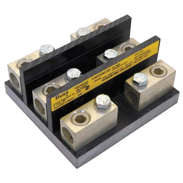 Fuse Block, Fits Fuse Type Class T, Fuse UL Class T, 101 to 200 A, Number of Poles 3, 300V AC/DC, For Fuse Size 2 7/16 in L x 1 1/16 in dia, 2 7/16 in L x 7/8 in dia, Compatible Fuse Series A3T, JJN, JLLN, TJN, Series T, Non-Indicating, Non-Rejection, Fuse Block Design Open, Wire Range 6 AWG to 250 MCM, Mounting Style Bolt-Down, Body Material Fiberglass Reinforced Thermoplastic, Connector Type Box Lug, Height 2.38 in, Width 4.46 in, Length 6 in, Features Space Saver