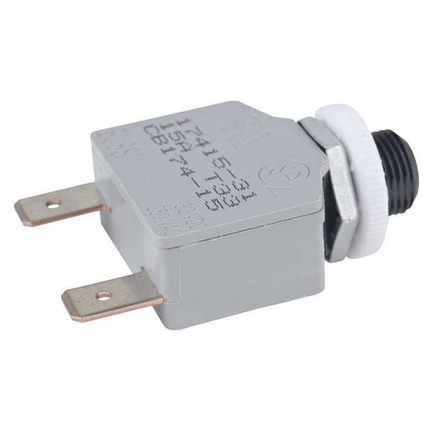Panel Mount Circuit Breaker, Amps 15 A, AC Voltage Rating 250V AC, Terminal Connection 1/4 in Quick Connect, DC Voltage Rating 32V DC, Manual Reset, Number of Poles 1, Circuit Breaker Actuator Push Button, Max. AIR Rating 1kA at 250V AC, Curve Type Medium, Phase Single, Mounting Type Panel, Actuator Color White, Panel Cutout Size 0.375 in dia, Max. Panel Thickness 0.375 in, Mounting Hole Thread Size 3/8 In.-27, Length 2.21 in, Width 1.11 in, Depth 0.48 in, Min. Operating Temp. Not Rated