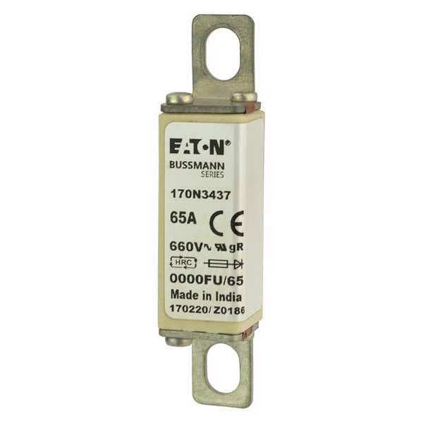 Semiconductor Fuse, 65 A, 660 V AC, Not Applicable, 170N Series, Indicating, Fast-Acting, Body Style Bolt-On, Non-Rejection, Interrupt Rating 200kA at 660V AC, Fuse Size 3-9/64 in L x 43/64 in D x 43/64 in W, Length 3 1/8 in, Width 43/64 in, Depth 43/64 in, Diameter Not Applicable, Equivalent Brand and Series Bussmann 170N, Equivalent Series 170N, Body Material Ceramic, Single Element, Standards IEC