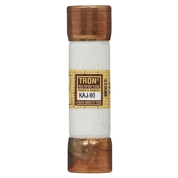 Semiconductor Fuse, 60 A, 600 V AC, Not Rated, Tron KAJ Series, Non-Indicating, Fast-Acting, Body Style Cylindrical, Non-Rejection, Interrupt Rating 5kA at 600V AC, Fuse Size 3 in L x 13/16 in dia, Length 3 in, Diameter 13/16 in, Equivalent Brand and Series Bussmann Tron KAJ, Equivalent Series KAJ, Body Material Melamine, Single Element