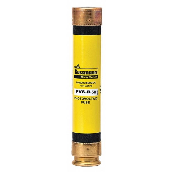 Solar Fuse, 50 A, 600 V AC, 600 V DC, Class RK5, PVS-R Series, Non-Indicating, Fast-Acting, Body Style Cylindrical, Rejection, Interrupt Rating 200kA at 600V AC, 20kA at 600V DC, Fuse Size 5-1/2 in L x 1-1/16 in dia, Length 5 1/2 in, Diameter 1 1/16 in, Equivalent Brand and Series Bussmann PVS-R, Equivalent Series PVS-R, Body Material Fiberglass, Single Element, Standards CSA Component Certified C22.2, File E335324, Guide JFGA, Photovoltaic to UL 2579, UL Std. 248-12, ClasUL Listed