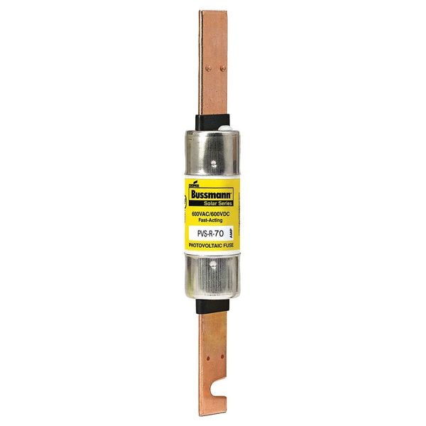 Solar Fuse, 70 A, 600 V AC, 600 V DC, Class RK5, PVS-R Series, Non-Indicating, Fast-Acting, Body Style Cylindrical, Rejection, Interrupt Rating 10kA at 600V DC, 200kA at 600V AC, Fuse Size 7-7/8 in L x 1-5/16 in dia, Length 7 7/8 in, Diameter 1 5/16 in, Equivalent Brand and Series Bussmann PVS-R, Equivalent Series PVS-R, Body Material Fiberglass, Single Element, Standards CSA Component Certified C22.2, File E335324, Guide JFGA, Photovoltaic to UL 2579, UL Std. 248-12, ClasUL Listed