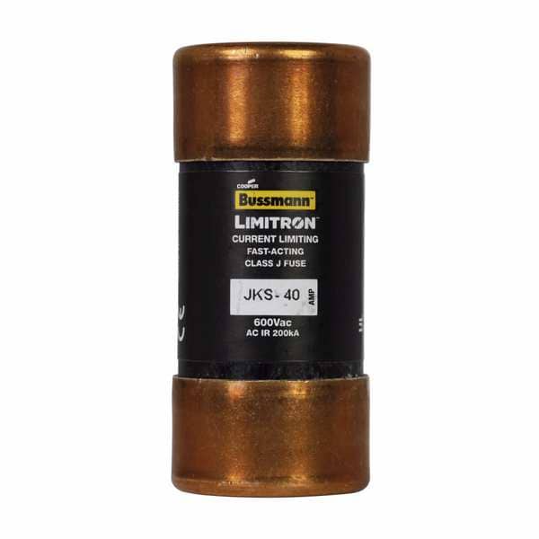 Fuse, 40 A, 600 V AC, Not Applicable, Class J, JKS Series, Non-Indicating, Fast-Acting, Body Style Cylindrical, Fits Fuse Block Style Non-Rejection, Interrupt Rating 200kA at 600V AC, Fuse Size 2-3/8 in L x 1-1/16 in dia, Length 2 3/8 in, Diameter 1 1/16 in, Equivalent Brand and Series Bussmann JKS, Littelfuse JLS, Mersen A4J, Equivalent Series A4J, JKS, JLS, Compatible Fuse Block Series CH60J, JM600, JT600, JTN600, Body Material Melamine, Single Element