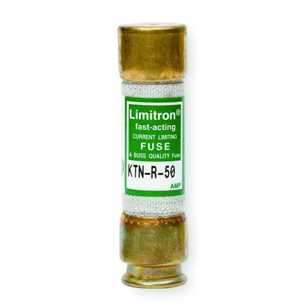 Fuse, 50 A, 250 V AC, 250 V DC, Class RK1, KTN-R Series, Non-Indicating, Fast-Acting, Body Style Cylindrical, Fits Fuse Block Style Rejection, Interrupt Rating 100kA at 250V DC, 200kA at 250V AC, Fuse Size 3 in L x 81/100 in dia, Length 3 in, Diameter 81/100 in, Equivalent Brand and Series Bussmann KTN-R, Littelfuse KLNR, Mersen A2K-R, Equivalent Series A2K-R, KLRN, KTN-R, Compatible Fuse Block Series HM250, RM250, Body Material Melamine, Single Element