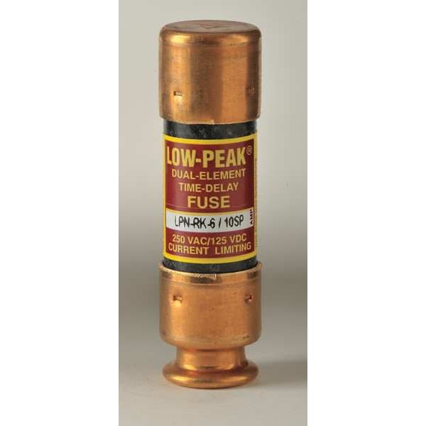 Fuse, 6/10 A, 250 V AC, 125 V DC, Class RK1, LPN-RK-SP Series, Non-Indicating, Time-Delay, Body Style Cylindrical, Fits Fuse Block Style Rejection, Interrupt Rating 100kA at 125V DC, 300kA at 250V AC, Fuse Size 2 in L x 9/16 in dia, Length 2 in, Diameter 9/16 in, Equivalent Brand and Series Bussmann LPN-RK-SP, Littelfuse LLNRK, Mersen A2D-R, Equivalent Series A2D-R, LLNRK, LPN-RK-SP, Compatible Fuse Block Series HM250, RM250, Body Material Melamine, Dual Element
