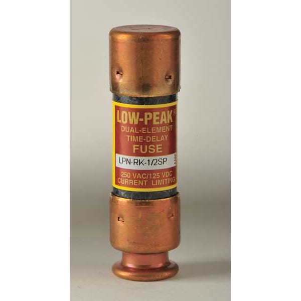 Fuse, 1/2 A, 250 V AC, 125 V DC, Class RK1, LPN-RK-SP Series, Non-Indicating, Time-Delay, Body Style Cylindrical, Fits Fuse Block Style Rejection, Interrupt Rating 100kA at 125V DC, 300kA at 250V AC, Fuse Size 2 in L x 9/16 in dia, Length 2 in, Diameter 9/16 in, Equivalent Brand and Series Bussmann LPN-RK-SP, Littelfuse LLNRK, Mersen A2D-R, Equivalent Series A2D-R, LLNRK, LPN-RK-SP, Compatible Fuse Block Series HM250, RM250, Body Material Melamine, Dual Element