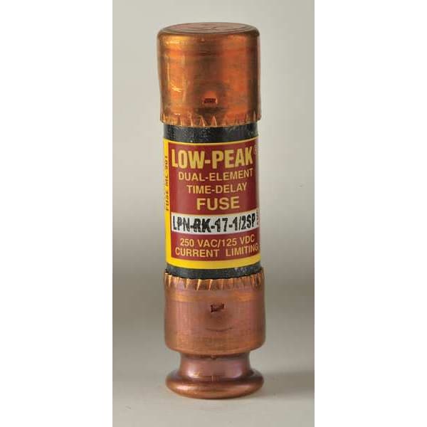 Fuse, 17 1/2 A, 250 V AC, 125 V DC, Class RK1, LPN-RK-SP Series, Non-Indicating, Time-Delay, Body Style Cylindrical, Fits Fuse Block Style Rejection, Interrupt Rating 100kA at 125V DC, 300kA at 250V AC, Fuse Size 2 in L x 9/16 in dia, Length 2 in, Diameter 9/16 in, Equivalent Brand and Series Bussmann LPN-RK-SP, Littelfuse LLNRK, Mersen A2D-R, Equivalent Series A2D-R, LLNRK, LPN-RK-SP, Compatible Fuse Block Series HM250, RM250, Body Material Melamine, Dual Element