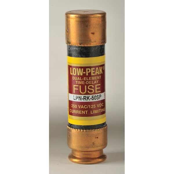 Fuse, 50 A, 250 V AC, 125 V DC, Class RK1, LPN-RK-SP Series, Non-Indicating, Time-Delay, Body Style Cylindrical, Fits Fuse Block Style Rejection, Interrupt Rating 100kA at 125V DC, 300kA at 250V AC, Fuse Size 3 in L x 13/16 in dia, Length 3 in, Diameter 13/16 in, Equivalent Brand and Series Bussmann LPN-RK-SP, Littelfuse LLNRK, Mersen A2D-R, Equivalent Series A2D-R, LLNRK, LPN-RK-SP, Compatible Fuse Block Series HM250, RM250, Body Material Melamine, Dual Element