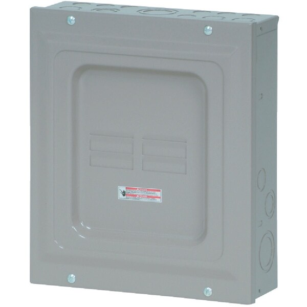 Single-phase 3-wire main lug load center. Flush surface or combination mount. Cover included. Straight-in wiring top or bottom. Pre-attached neutral bonding strap. Solid copper bus and branch fingers. 120/240V AC; 10000 AIC. UL (Underwriters Laboratories) listed.