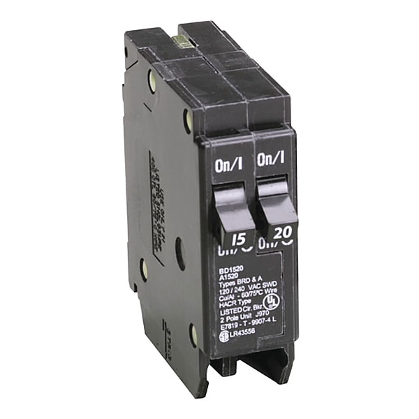 Circuit Breaker, Amps 15/20 A, AC Voltage Rating 120V AC, Circuit Breaker Type Tandem, Number of Poles 1, DC Voltage Rating Not Rated, Circuit Breaker Actuator Toggle, Circuit Breaker Mounting Style Plug In, Compatible Panelboard/Load Center Series BD, Phase Single, Series BD, Max. AIR Rating 10kA at 120V AC, For Use With Type BR Loadcenters, Length 3.2 in, Width 1 in, Depth 4 in, Min. Wire Size 14 AWG, Max. Wire Size 4 AWG, Standards UL 489, Federal Specifications Classification W-C375