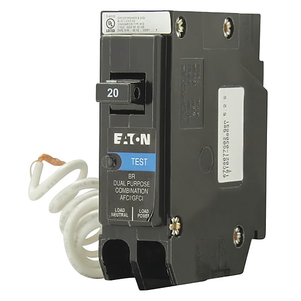 Circuit Breaker, Amps 20 A, AC Voltage Rating 120V AC, Circuit Breaker Type Arc & Ground Fault Circuit Interrupter with Plug-On Neutral, Number of Poles 1, DC Voltage Rating Not Rated, Circuit Breaker Actuator Toggle, Circuit Breaker Mounting Style Plug In, Compatible Panelboard/Load Center Series BR, Phase Single, Series BR, Max. AIR Rating 10kA at 120V AC, For Use With Type BR Loadcenters, Length 2.9 in, Width 1 in, Depth 0.9 in, Min. Wire Size 14 AWG, Max. Wire Size 4 AWG