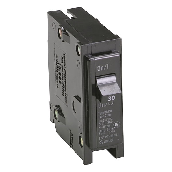 Circuit Breaker, Amps 30 A, AC Voltage Rating 120/240V AC, Circuit Breaker Type Standard, Number of Poles 1, DC Voltage Rating Not Rated, Circuit Breaker Actuator Toggle, Circuit Breaker Mounting Style Plug In, Compatible Panelboard/Load Center Series BR, Phase Single, Series BR, Max. AIR Rating 10kA at 120/240V AC, For Use With Type BR Loadcenters, Length 3 in, Width 1 in, Depth 3 in, Min. Wire Size 14 AWG, Max. Wire Size 4 AWG, Standards UL 489, Federal Specifications Classification W-C375
