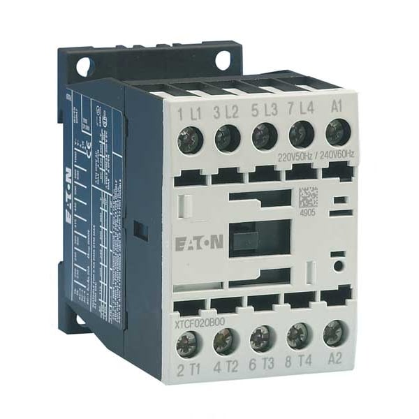 The Eaton XT IEC contactor is an IEC magnetic contactor used to switch power circuits. It is a 4-pole, non-reversing device with a 120V AC coil and screw terminals, and it does not include auxiliary contacts. This XT series (Frame B) unit is rated within the specified voltage and current ranges, with IP20 protection and no enclosure. It supports mounting on DIN rail or panel, and dimensions are approximately 3 in W x 2 in H x 2.75 in D, with a mechanical durability of 10,000,000 cycles.