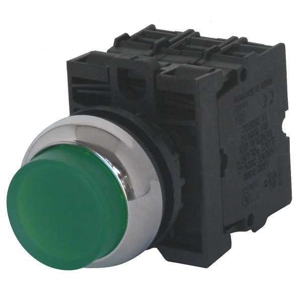 Illuminated Push Button, 22 mm, Momentary Action, Extended Button Type of Operator, Head Material Metal, Contact Form 2NO, Bezel Chrome Die Cast Aluminum, Color Green, Contact Rating 3A @ 24 DC, 6A @ 230V AC, NEMA Contact Rating Designation AC-15, DC-13, Number of Operators 1, NEMA Rating 1, 13, 2, 3, 4, 4X, IP Rating IP66, IP67, IP69K, Standards Bureau Veritas, CCC, CE, CSA, GOST-R, Lloyd's Register, UL Listed, Terminal Connection Screw Clamp
