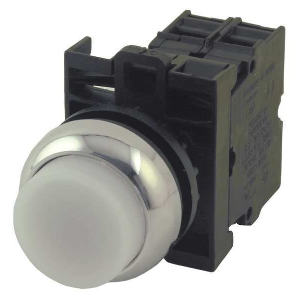 Illuminated Push Button, 22 mm, Momentary Action, Extended Button Type of Operator, Head Material Metal, Contact Form 2NO, Bezel Chrome Die Cast Aluminum, Color White, Contact Rating 3A @ 24 DC, 6A @ 230V AC, NEMA Contact Rating Designation AC-15, DC-13, Number of Operators 1, NEMA Rating 1, 13, 2, 3, 4, 4X, IP Rating IP66, IP67, IP69K, Standards Bureau Veritas, CCC, CE, CSA, GOST-R, Lloyd's Register, UL Listed, Terminal Connection Screw Clamp
