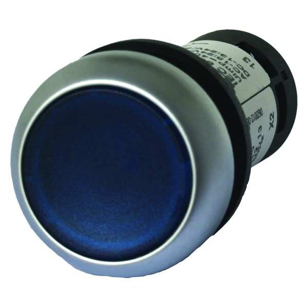 Illuminated Push Button, 22 mm, Momentary Action, Flush Button Type of Operator, Head Material Polycarbonate, Contact Form 1NO, Bezel Silver Coated Polycarbonate, Color Blue, Contact Rating 1.5A @ 230V AC, 3A @ 24V DC, NEMA Contact Rating Designation AC-15, DC-13, Number of Operators 1, NEMA Rating 1, 12, 13, 3, 4X, IP Rating IP67, IP69K, Standards CCC, CE, CSA, IEC 60947, Lloyd's Register, RoHS, UL Listed, VDE 0660, Terminal Connection Screw Clamp