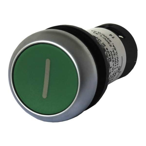 Illuminated Push Button, 22 mm, Momentary Action, Flush Button Type of Operator, Head Material Polycarbonate, Contact Form 1NO, Bezel Silver Coated Polycarbonate, Color Green, Contact Rating 1.5A @ 230V AC, 3A @ 24V DC, NEMA Contact Rating Designation AC-15, DC-13, Number of Operators 1, NEMA Rating 1, 12, 13, 3, 4X, IP Rating IP67, IP69K, Legend I, Legend/Background Color White/Green, Standards CCC, CE, CSA, IEC 60947, Lloyd's Register, RoHS, UL Listed, VDE 0660, Terminal Connection Screw Clamp