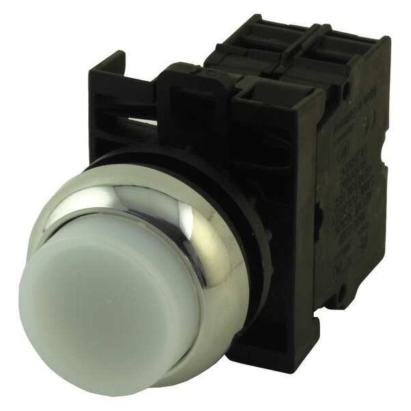 Illuminated Push Button, 22 mm, Momentary Action, Extended Button Type of Operator, Head Material Metal, Contact Form 2NO, Bezel Chrome Die Cast Aluminum, Color White, Contact Rating 3A @ 24 DC, 6A @ 230V AC, NEMA Contact Rating Designation AC-15, DC-13, Number of Operators 1, NEMA Rating 1, 13, 2, 3, 4, 4X, IP Rating IP66, IP67, IP69K, Standards Bureau Veritas, CCC, CE, CSA, GOST-R, Lloyd's Register, UL Listed, Terminal Connection Screw Clamp