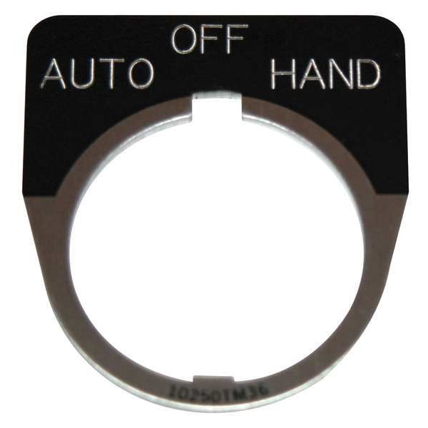 Legend Plate, Half-Round, Legend Auto-Off-Hand, For Use With 30.5mm Selector Switch and Roto-Push Operators, Legend/Background Color Black, Material Aluminum, Height 1.75 in, Width 1.75 in, Diameter 30 mm