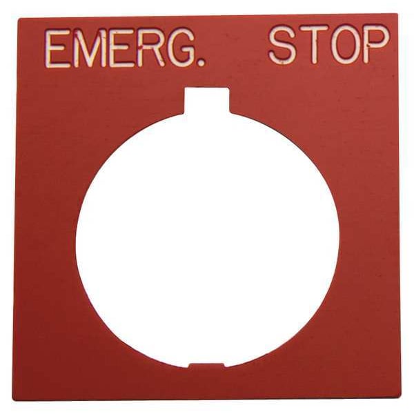 Legend Plate, Square, Legend Emergency Stop, For Use With 30.5mm Pushbutton Operators and Indicating Lights, Legend/Background Color Black/Red, Material Plastic, Height 1.77 in, Width 1.77 in, Diameter 30 mm