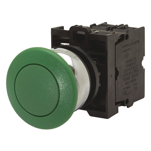 Mushroom Head Push Button, 22.5 mm, Maintained, Type of Operator 35 mm Mushroom Head, Basic Material Plastic, Head Material Plastic, Bezel Material Silver, Color Green, NEMA Rating 4X,13, IP Rating IP67, IP69K, Legend Not Applicable, Standards Bureau Veritas, CCC, CE, CSA, GOST-R, Lloyd's Register, UL Listed, Features Field Convertible From Momentary to Maintained, Includes Contact Block Mounting Adapter