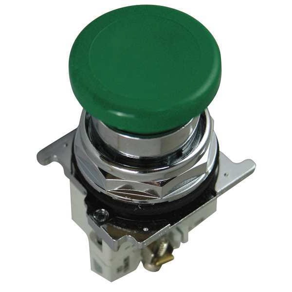 Mushroom Head Push Button, 30 mm, Momentary Action, 40mm Mushroom Head Type of Operator, Head Material Metal, Contact Form 1NC, Bezel Chrome Plated Zinc Die Cast, Color Green, Contact Rating 10A @ 600V AC, Number of Operators 1, NEMA Rating 12, 13, 3, 3R, 4, 4X, IP Rating IP65, Legend No Legend, Standards CE EN 60947-5-1, CE EN 60947-5-5, CSA C22.2 No.14, CSA LR68551, RoHS, UL 508, UL 131568, Terminal Connection Screw Clamp