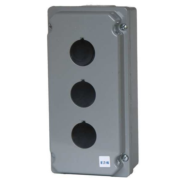 Push Button Enclosure, Number of Columns 1, Number of Holes 3, NEMA Rating 12, 13, 4, 4X, Conduit Size 1 in, Dimensions 7.75 in H x 3.88 in W x 3.00 in D, Hole Size 30 mm, Material Die Cast Zinc, Height 7.75 in, Width 3.88 in, Depth 3 in, Color Gray, For Use With E34 and 10250T Eaton Push Buttons, Mounting Style Surface, Standards CE, CSA, FDA 3-A, UL 505