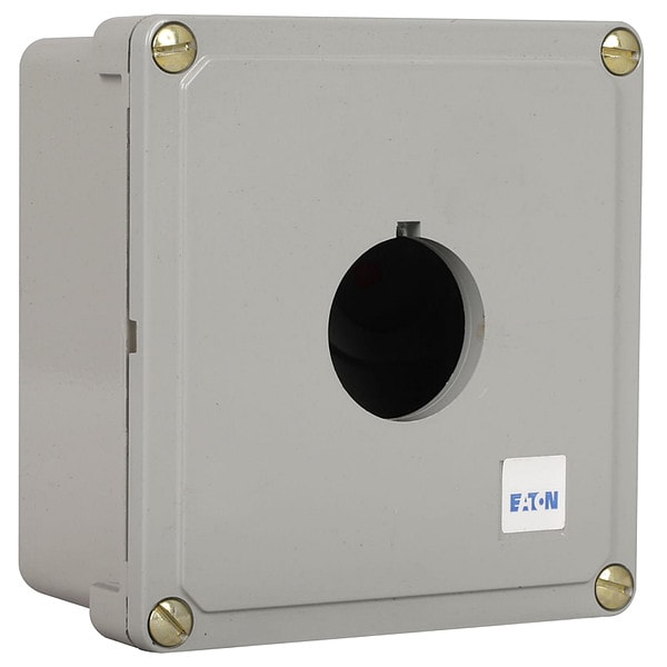 Push Button Enclosure, Number of Columns 1, Number of Holes 2, NEMA Rating 12, 13, 4, 4X, Conduit Size 3/4 in, Dimensions 5.88 in H x 3.88 in W x 3.00 in D, Hole Size 30 mm, Material Die Cast Zinc, Height 5.88 in, Width 3.88 in, Depth 3 in, Color Gray, For Use With E34 and 10250T Eaton Push Buttons, Mounting Style Surface, Standards CE, CSA, FDA 3-A, UL 505
