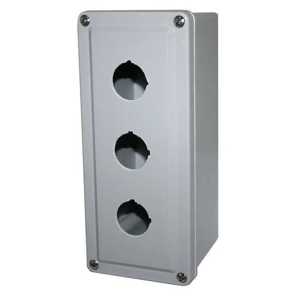 Push Button Enclosure, Number of Columns 1, Number of Holes 3, NEMA Rating 12, 3, 4X, Conduit Size No Conduit Entrance Holes Provided, Dimensions 8.88 in H x 3.81 in W x 3.38 in D, Hole Size 30 mm, Material Polyester, Height 8.88 in, Width 3.81 in, Depth 3.38 in, Color Gray, Includes (2) Contact Block Depths, Element, Type Hazardous Location, For Use With E34 and 10250T Eaton Push Buttons, Mounting Style Surface, Contact Block Depth 3.5 in, Standards CE, CSA, FDA 3-A, UL 505