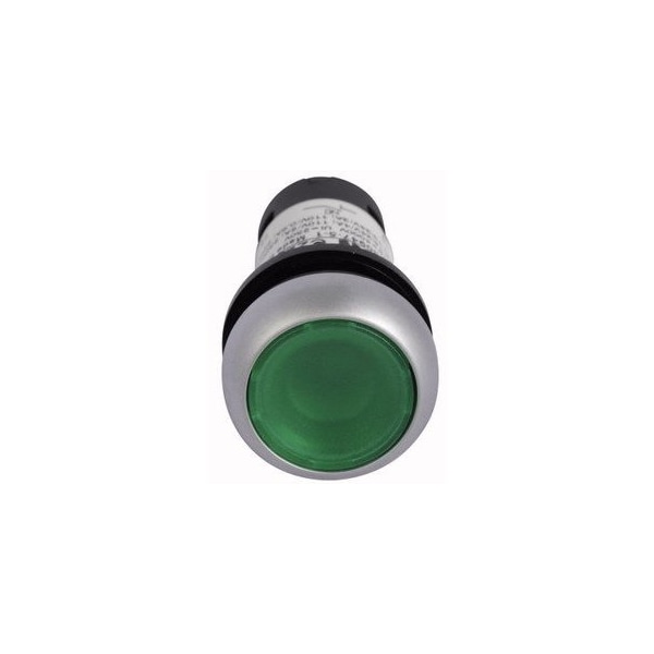 22.5 MM, 230 VAC, 1NO, NEMA 4X/13, IP67/69K, Green LED, Green Cap/Lens, Silver Titanium Bezel, Maintained, Flush, Flat, Round