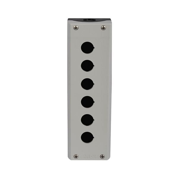 Surface Mount Enclosure, M22 series, Six-element. This attractive, functional line of pushbuttons features a space-saving construction that enables fast assembly. The complete illuminated M22 line offers LED light units to ensure high-quality brightness and up to 100,000 hours of illumination. Because of the rugged design of these pushbuttons, most operators and contact blocks exceed five million mechanical operations.