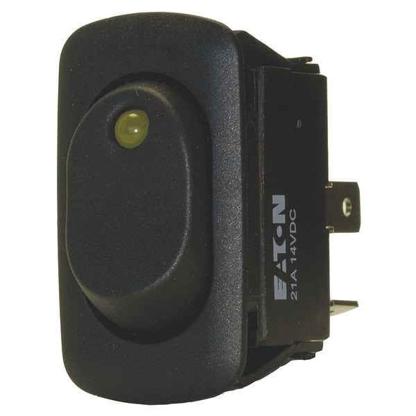 Lighted Rocker Switch, Contact Form SPST, Number of Connections 3, Switch Function Off/On, Terminals 0.250 in Quick Connect Tab, Mounting Hole 0.830 in x 1.460 in, AC Contact Rating 10 A @ 277 V, 16 A @ 125 V, HP 3/4 hp, Standards cRUus, RoHS, UL E2702, IP Rating IP56, Special Features 14V DC LED Indicator Light, Illuminated