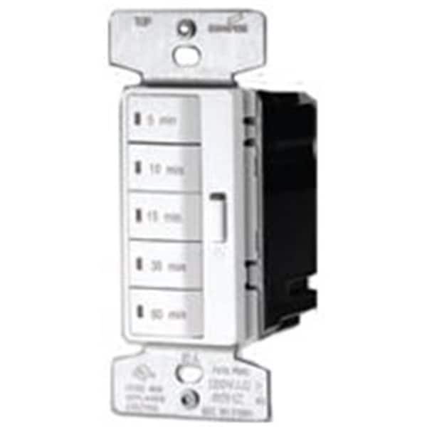 Programmable time delay in 2 modes. Five (5) preset time intervals. Operates incandescent/halogen, magnetic low-voltage, electronic low-voltage, fluorescent, compact fluorescent and LED lighting load types. For both new construction and retrofit with no neutral required for installation. Horsepower rated for 1/4 HP motor loads. LED indication of time interval selected and countdown. 15 amp, 1800 watts, 120 volt ac.