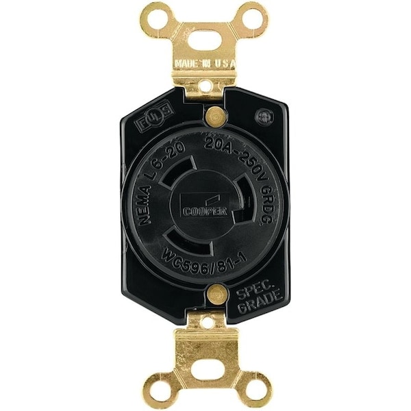 Locking Receptacle, L6-20R, 20 A, 250V AC, 2 Pole, Screw Terminals, Black