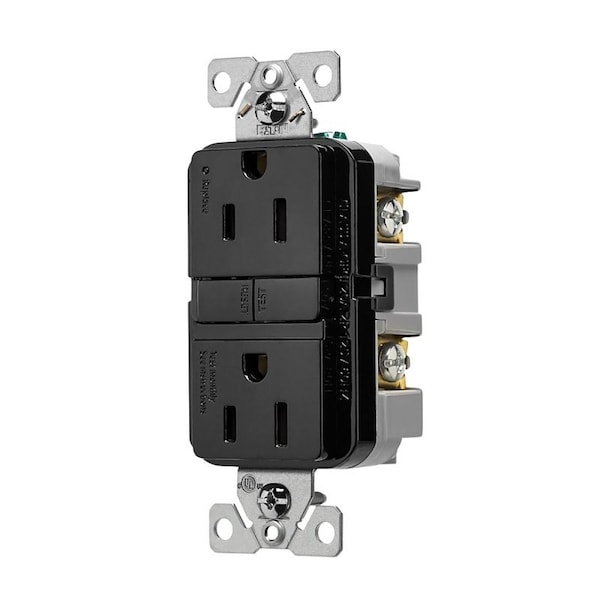 Eaton Receptacle, Self-Test, Tamper-Resistant, 125 V, 15 A, Number of Poles: 2, Socket Type: GFCI, Short Circuit Current Rating: 10 kA, Grounding Type: Self-Grounding, Number of Wires: 3, Wire Size: 14 to 10 AWG, Wiring Type: Back, Side, NEMA Rating: 5-15R, Operating Temperature: -35 to 66 deg C, Polycarbonate/PVC/Thermoplastic, Black, Dimensions: 4.19 in H x 1.69 in W x 1.03 in D