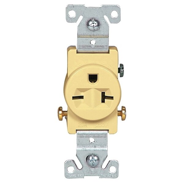 Straight blade receptacle. Meets all UL and CSA specifications. Triple wire line contacts provide excellent long-term plug retention. High impact and chemical-resistant nylon face. Side wire terminals accept up to #10 solid or stranded wire. Terminal screws backed out. 20 amp, 250 volt.