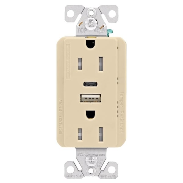 TRUSBAC15 Receptacle, 2 Pole, 5 A, 125 VAC, 2 USB Port, Type A, C USB, Ivory