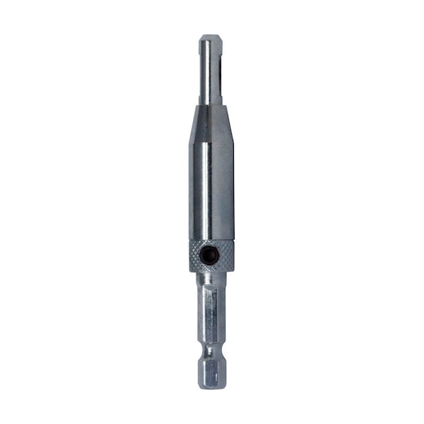 Spring loaded with hex key to adjust drilling depth. Drills perfectly centered holes in applications such as installing hinges, brackets, towel bars, cabinet hardware, drapery rods, window shades and blinds.