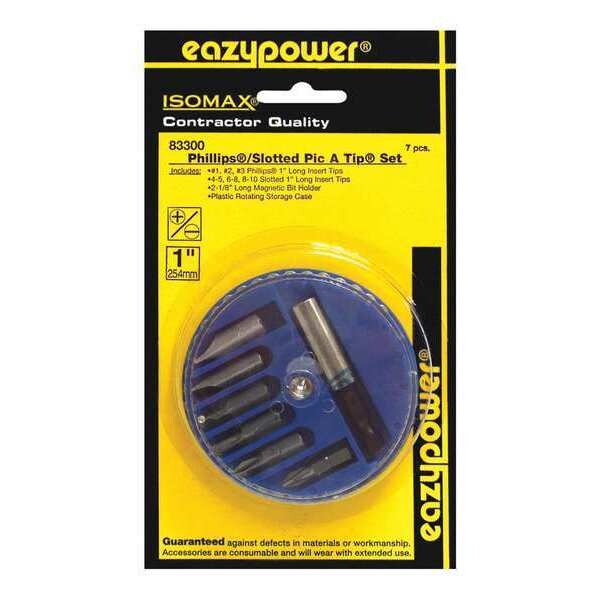 (3) Phillps Insert Bit of 1" Length: Tip sizes #1, #2, #3; (3) Slotted of 1" Length: Tip sizes 4-5, 6-8, 8-10; (1) Magnetic Bit Holder of length 1" tip size 1/4" hex 2-1/8"