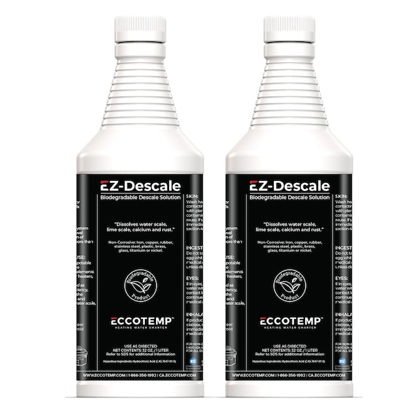 The Eccotemp System Descaler is made to quickly dissolves water scale, lime, rust, and other water formed deposits, restoring efficiency to most all appliances. The Eccotemp System Descaler is a non-toxic concentrate which is certified to NSF/ANSI 60 for use as a cleaner in potable water systems.