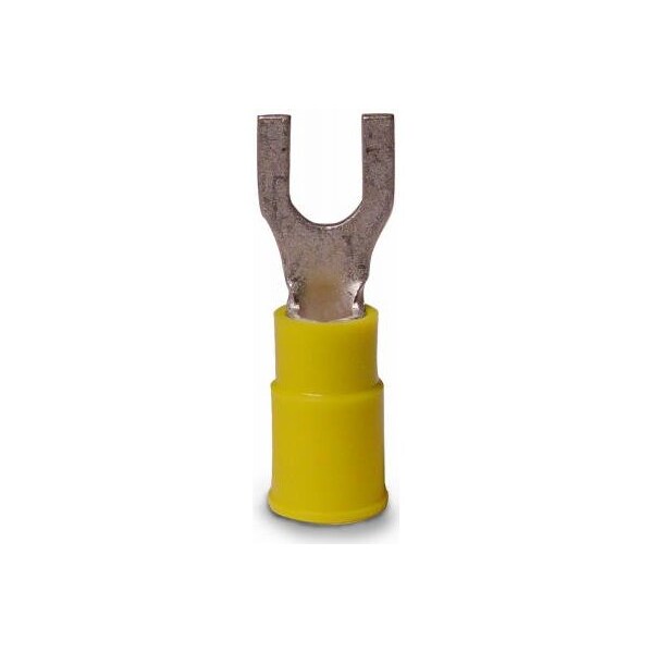14 Pack, Spade Terminal, Vinyl Insulated Barrel, Solderless, 810 Stud, 1210 AWG, Rated At 600V Maximum, Temperature Rating 167 Degrees Fahrenheit, 75 Degrees Celsius, UL Approved
