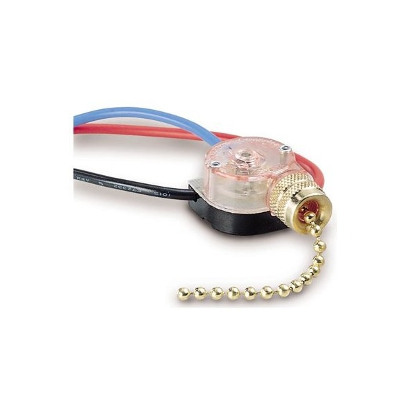 Brass Plated Pull Chain Switch, 6A125Vac, DP3t, OffOn A, On B, On AB, Variable Speed Switching, 6 Wire Lead Connections, Recommended Mounting Hole Fits 1332 Diameter, Carded